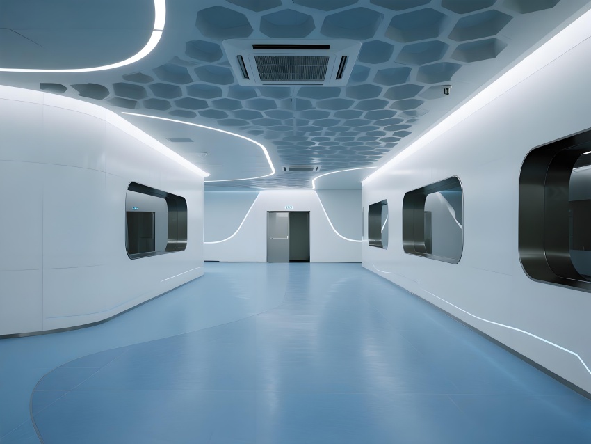 本車間空間以冰川藍(lán)與鈦白為主色調(diào),弧形墻角與無縫地坪構(gòu)成流暢的潔凈界面,頂部蜂窩狀FFU陣列形成科技感天花肌理。灌裝區(qū)透明亞克力防護(hù)罩展示自動(dòng)化生產(chǎn)線運(yùn)作,配合層流工作臺(tái)的紅色氣流可視化設(shè)計(jì),強(qiáng)化無菌核心概念。功能模塊通過地面灰色導(dǎo)視帶串聯(lián),設(shè)備區(qū)的鏡面不銹鋼與控制面板的藍(lán)色背光形成冷調(diào)光效。玻璃觀察窗嵌入電子壓差計(jì),走廊的漸變光環(huán)境引導(dǎo)系統(tǒng)在滿足GMP動(dòng)態(tài)監(jiān)測要求的同時(shí),營造出未來實(shí)驗(yàn)室般的專業(yè)氛圍,緩解員工長時(shí)間密閉作業(yè)的疲勞感。