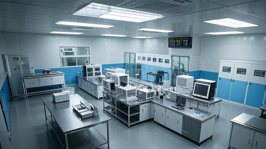 1000平方米電子無塵車間,現(xiàn)代科技風格,干凈整潔,光線明亮。核心生產(chǎn)區(qū)占70%,輔助區(qū)占20%,辦公區(qū)占10%。核心生產(chǎn)區(qū):防靜電環(huán)氧地坪(淺灰色),白色彩鋼板墻面和天花板,垂直層流氣流,頂部高效過濾器(HEPA),不銹鋼工作臺,設備排列整齊。輔助區(qū):更衣室(淺藍色墻面,衣柜和長凳),風淋室(透明玻璃門,不銹鋼墻面),物料緩沖間(傳遞窗,白色墻面)。辦公區(qū):玻璃隔斷,現(xiàn)代簡約辦公桌,防靜電PVC地板(淺色),LED面板燈。整體色彩:白色、淺灰色、科技藍點綴。