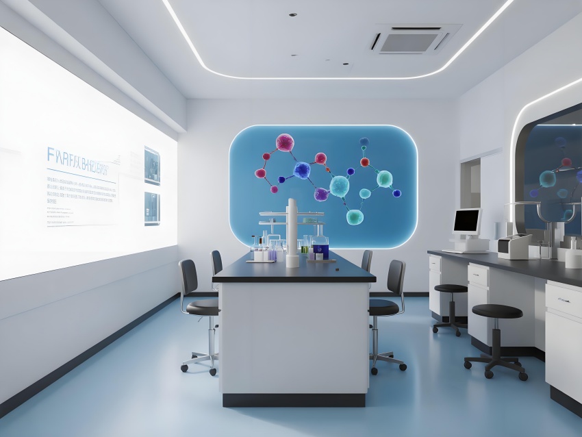 本設計以"科技賦能生命"為核心理念,構建純凈高效的研發環境。主體采用冰川白與醫用藍的漸變配色,墻面嵌入動態生物分子結構LED裝飾,營造科研儀式感。實驗區采用模塊化懸浮工作臺,透明智能玻璃隔斷實現空間通透性與功能分區的完美平衡。頂棚的流線型送風系統與地面熒光導視帶形成立體動線指引。核心無菌區采用圓形穹頂設計,搭配全息投影滅菌提示界面。數據分析中心配備曲面智能白板墻,實時可視化研究數據。?;反鎯^通過紅色光暈警示與物理隔離確保安全。整體空間融合醫療級潔凈美學與科幻實驗室語言,在嚴謹中注入未來感,通過智能交互界面與人性化燈光系統,打造國際一流水準的醫藥研發矩陣空間。