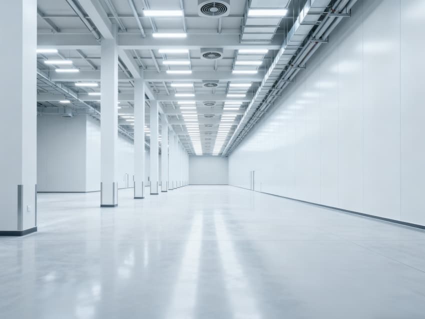 內部6個生產車間均為無設備空曠布局,按工業級潔凈與承重標準建設:地面鋪設耐磨防靜電環氧地坪,墻面采用白色環保潔凈墻板,陰陽角做圓弧處理減少積塵;柱網間距達10米,預留設備安裝與物流通道空間;頂部整合恒溫恒濕新風系統與節能LED照明,管線暗藏于吊頂內,避免空間雜亂;車間之間通過通透玻璃隔斷銜接,進一步強化整體空曠感,為新能源產品規模化生產、柔性產線調整提供高效、潔凈的空間支撐。
