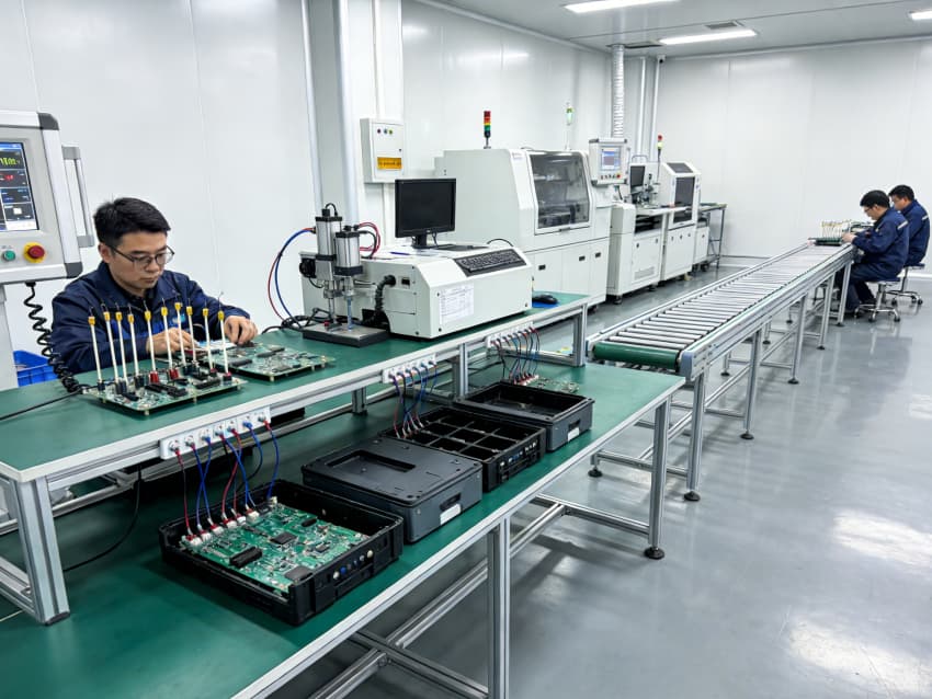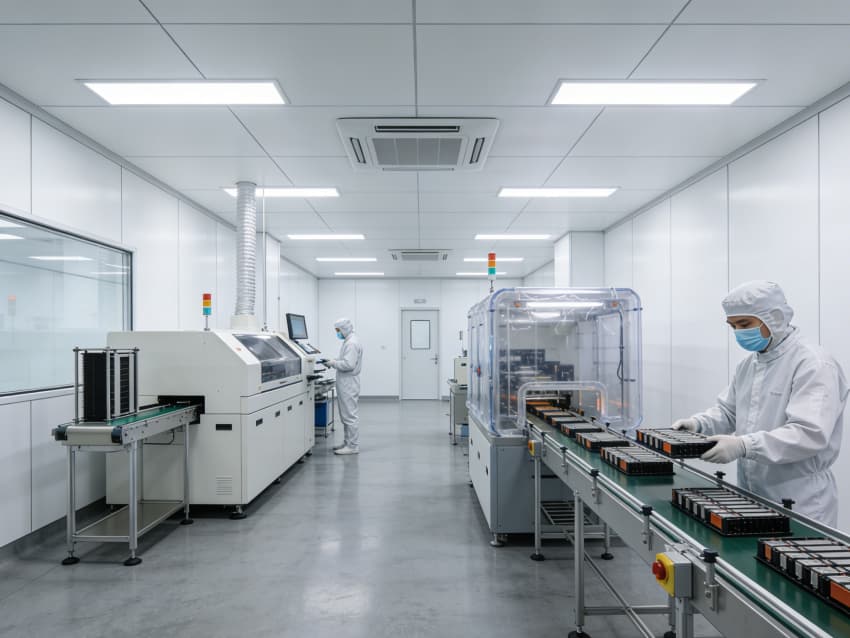 手工組裝與測試區(qū):采用模塊化防靜電工作臺(tái)布局,每個(gè)工位配備獨(dú)立電源接口與靜電手環(huán)接地端,線性燈帶提供均勻照明,旁側(cè)通風(fēng)系統(tǒng)有效驅(qū)散焊接產(chǎn)生的熱量與煙塵。