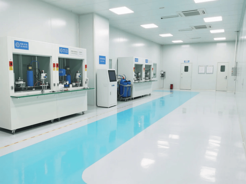 地面系統采用3mm厚環氧防靜電自流平工藝,表面電阻值穩定控制在10^6-10^9Ω,摩擦系數0.6-0.8,滿足精密電子制造對地面的特殊要求。吊頂系統采用FFU+HEPA高效過濾組合,換氣次數≥25次/h,維持穩定的層流狀態。功能分區通過淺藍色環氧劃線清晰標識,設備區采用啞光白不銹鋼包邊處理。