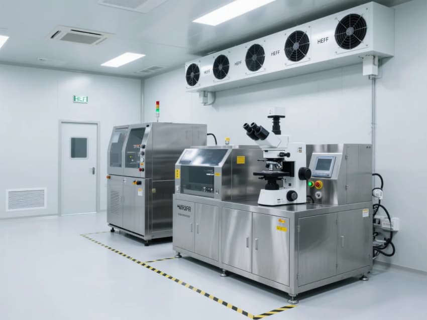 天花采用模塊化FFU(風(fēng)機過濾單元)系統(tǒng),配合高效HEPA過濾器,維持穩(wěn)定的氣流組織與潔凈度。設(shè)備區(qū)采用淺灰色不銹鋼圍擋,與白色潔凈墻面形成視覺區(qū)分,同時便于日常清潔維護。嵌入式LED無影燈帶提供均勻照明,減少作業(yè)陰影。整體設(shè)計強調(diào)功能性、安全性與可持續(xù)性,滿足電子光學(xué)制造的高標(biāo)準(zhǔn)環(huán)境需求。