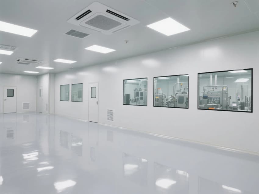 該潔凈車間采用國際標(biāo)準(zhǔn)的萬級無塵環(huán)境設(shè)計,以高級灰與純白為主色調(diào),營造出嚴(yán)謹(jǐn)、高效的工業(yè)美學(xué)。墻面采用抗靜電金屬夾芯板,表面經(jīng)納米涂層處理,兼具防塵與耐腐蝕性能。防靜電環(huán)氧樹脂地坪無縫鋪設(shè),電阻值嚴(yán)格控制在10^6~10^9Ω,確保精密電子元件生產(chǎn)過程中的靜電防護。