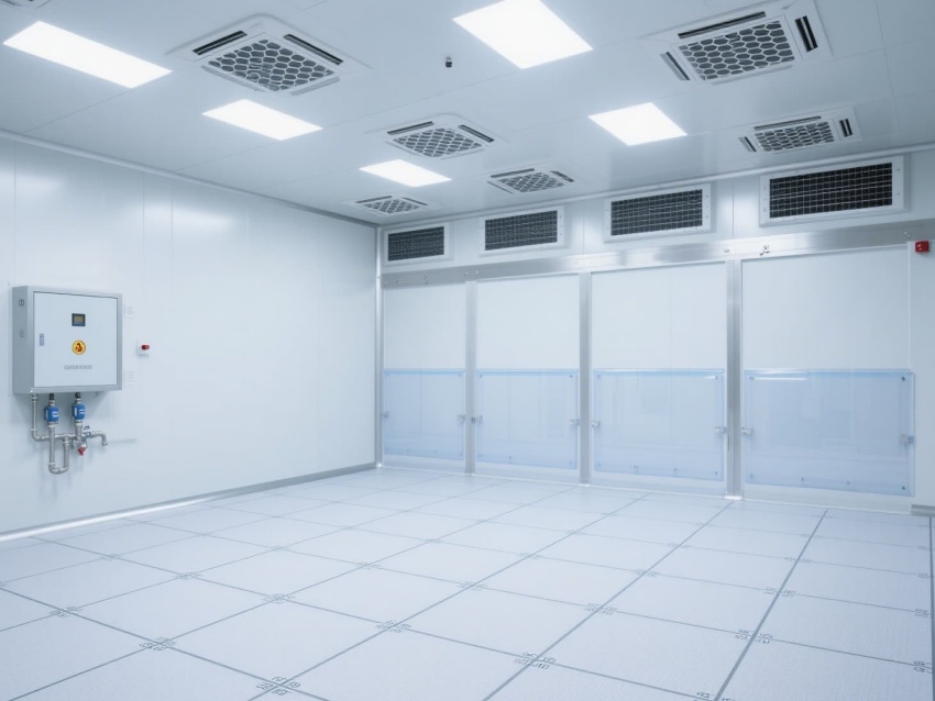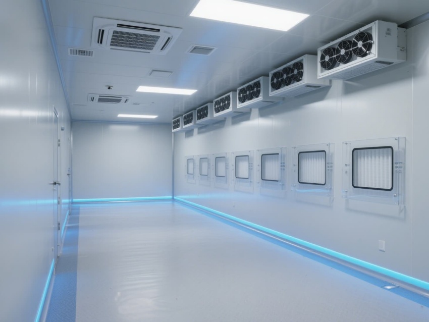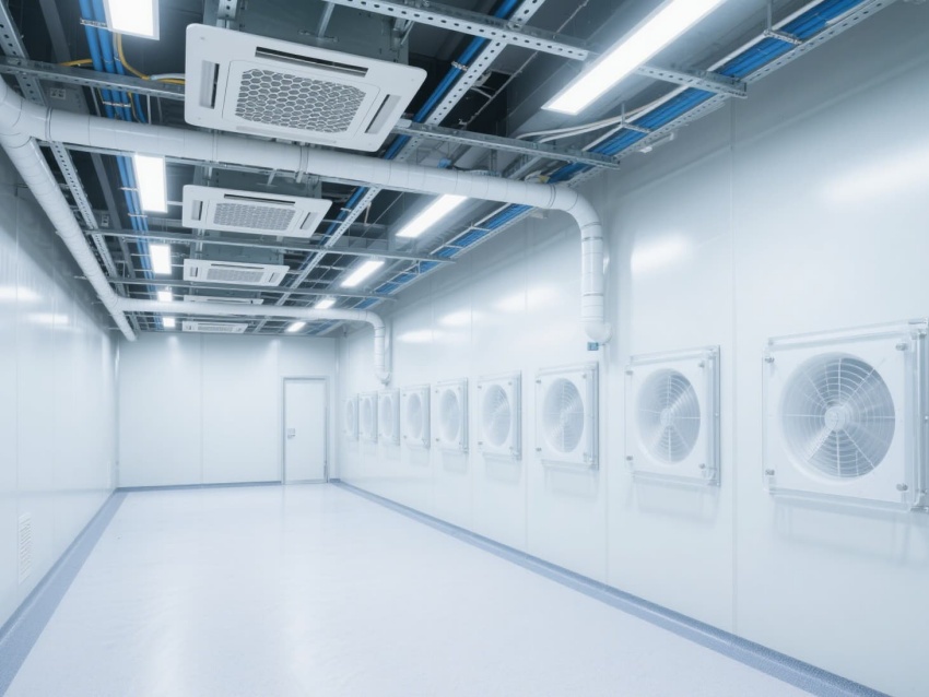 電子芯片廠無(wú)塵車間是芯片高精度生產(chǎn)的核心空間,其設(shè)計(jì)嚴(yán)格遵循百萬(wàn)級(jí)潔凈標(biāo)準(zhǔn)。車間以銀白色抗菌彩鋼板搭建墻體與吊頂,搭配淺灰色防靜電環(huán)氧地坪,形成簡(jiǎn)潔統(tǒng)一的視覺(jué)基調(diào)。頂部密布的高效過(guò)濾器與FFU風(fēng)機(jī)組,通過(guò)層流方式持續(xù)凈化空氣,確保每立方米空氣中0.5微米以上的塵埃顆粒不超過(guò)3520個(gè)。?