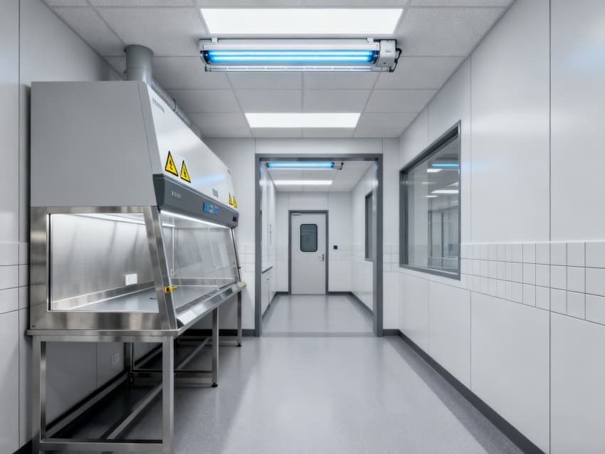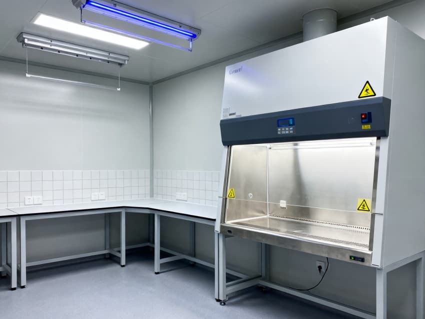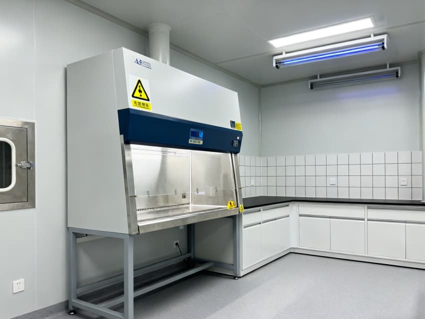 圍護結構選用304不銹鋼抗菌墻板與無縫PVC地面,轉角圓弧處理無衛生死角,配套紫外消毒系統與恒溫恒濕控制(22±1℃,50±5%RH),全面滿足微生物研究的無菌環境要求。