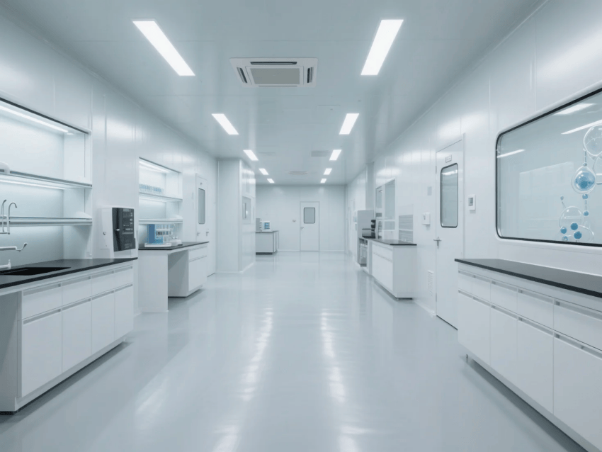 本實驗室嚴格遵循《生物安全實驗室建筑技術規范》GB50346標準,以"科技純凈"為設計理念,通過象牙白彩鋼板墻體與淺灰環氧樹脂地坪的極簡組合,打造符合P2防護要求的現代化研發空間。