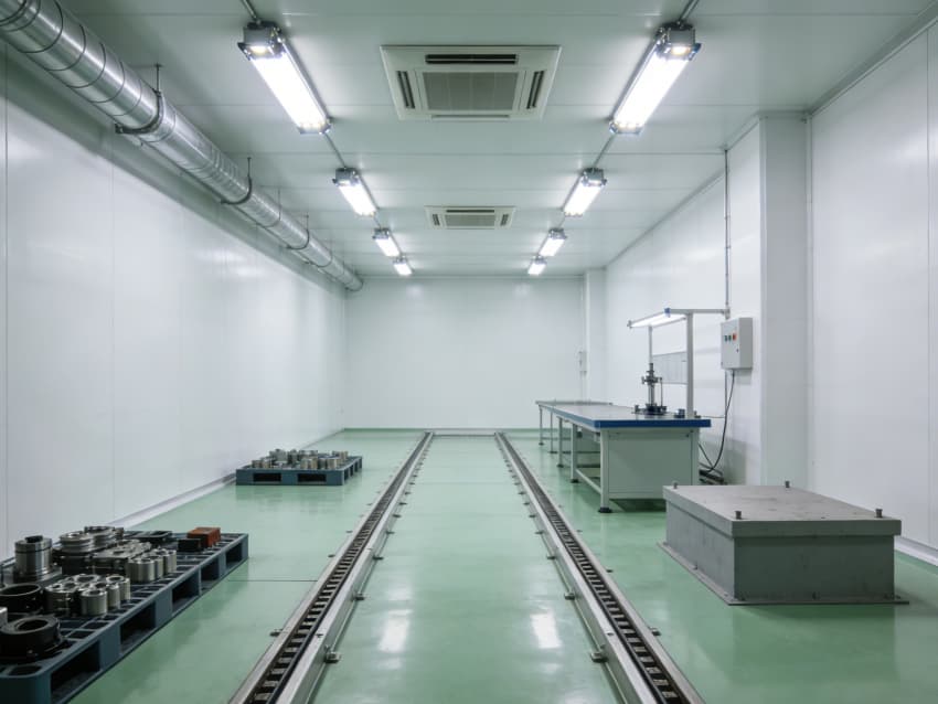 車間內(nèi)部施工工藝凸顯工業(yè)適配性:地面采用淺綠色防油耐磨環(huán)氧地坪工藝,經(jīng)基層固化處理、環(huán)氧砂漿找平、耐磨骨料撒布、罩面封閉四道核心工序,表面平整度誤差≤0.8mm/m,抗壓強(qiáng)度達(dá)C30以上,可耐受設(shè)備碾壓與油污侵蝕;墻面采用白色工業(yè)級潔凈涂層施工,推行無縫拼接技術(shù),陰陽角采用R40圓弧倒角工藝,杜絕積塵死角,涂層附著力強(qiáng),可耐受高頻次清潔與工業(yè)粉塵侵蝕。